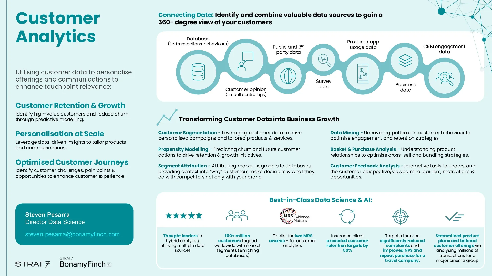 - Customer analytics – transactional, usage and customer databases